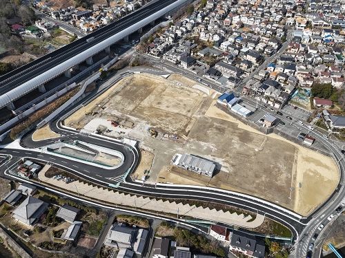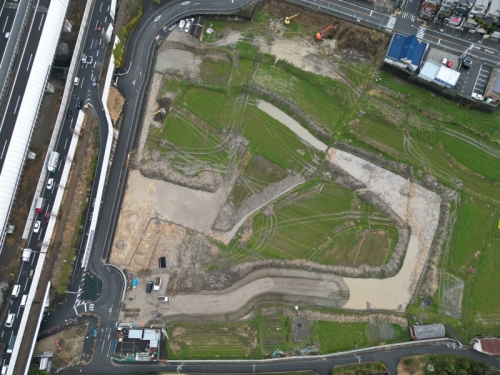 本プロジェクトは、もともと水田であった当該地(25,156㎡)において、当社が地権者の皆様との調整・取りまとめを行い、大和ハウス工業株式会社様が用地を取得。造成工事について、当社が請け負いました。