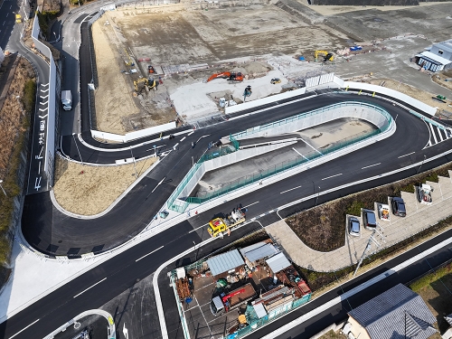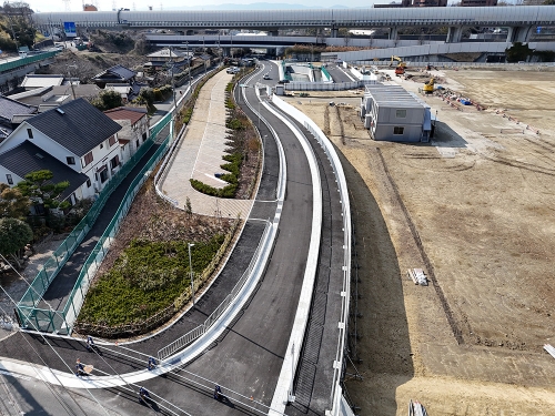 工期は約1年。施工にあたっては、ゆるやかなアーチ形状を含む道路工事や、第二京阪道路のオフランプとの接続工事など、特に高い施工精度が求められる工程もありましたが、関係者の皆様のご協力のもと、安全かつ円滑に工事を進めることができました。